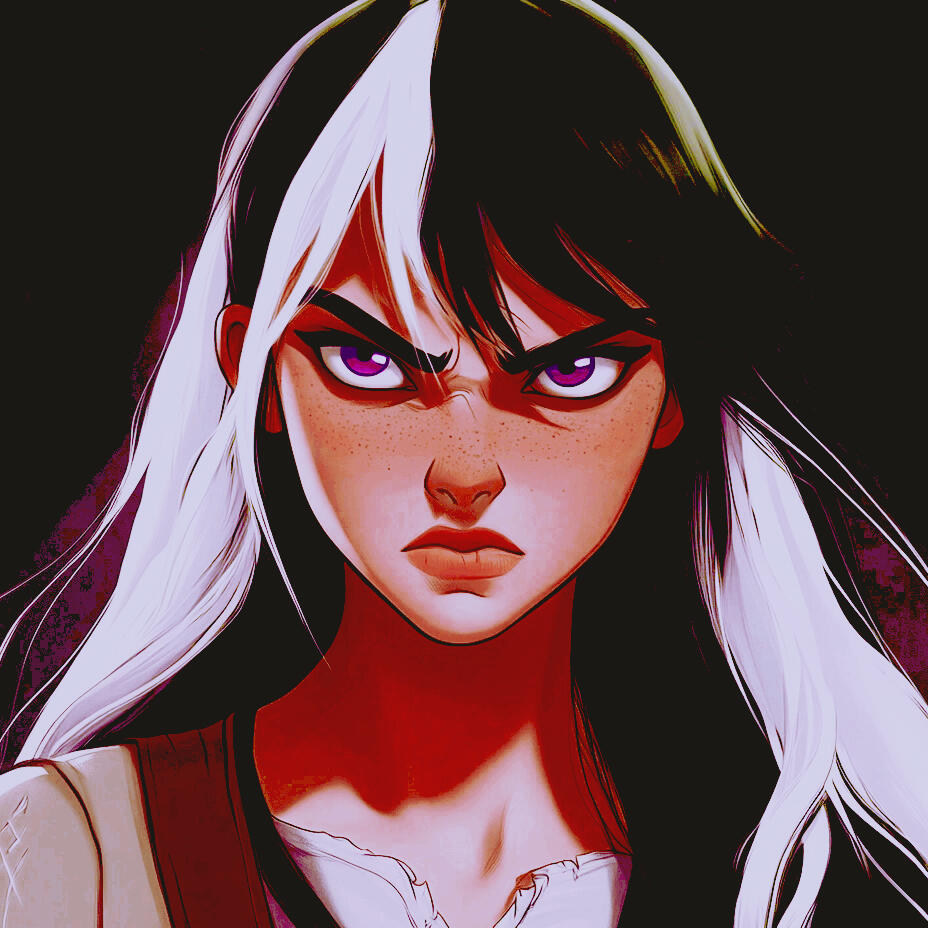 HEIGHT 5'10"HAIR long, black and whiteEYES brown...now purple due to shimmer use.PIERCINGS tight gold septum ring, multiple ear piercingsSCARS / TATTOOS / MARKINGS multiple scars, tattoos (details to come)FACE CLAIM N/ADISTINGUISHING FEATURES purple eyes due to shimmer use, perpetual frown, red rimmed eyes from crying a lot.PHYSICAL DESCRIPTION / FIRST IMPRESSION has a very lean build from parkouring a lot. almost looks like she should be shorter than she is in a chair, but once she stands up she's taller than expected. mostly legs. will have her hair tied in a bun at the back of her head when lounging around, but if on a job, she has it braided down her back.POSITIVE TRAITS loyal, trustworthy, ambitious, gentle, empathetic, kindNEGATIVE TRAITS judgemental, impulsive, self-destructiveASTROLOGY N/AMBTI N/ANEURODIVERGENCES & DISORDERS